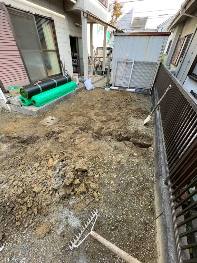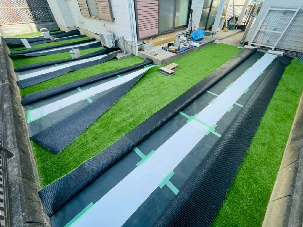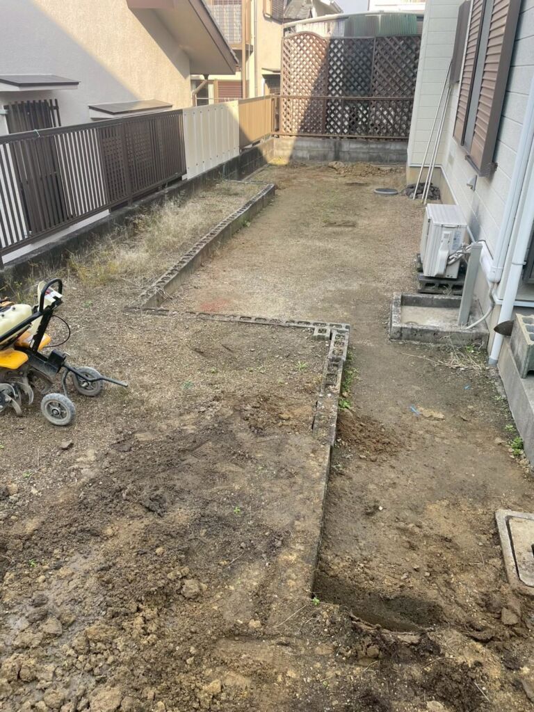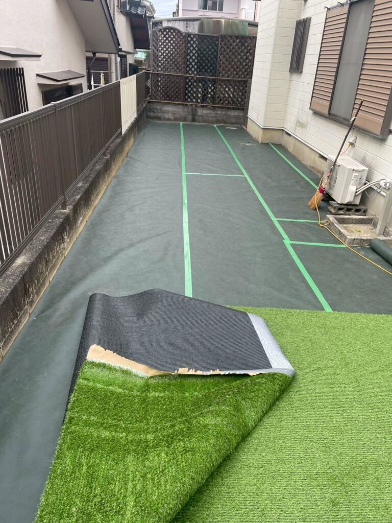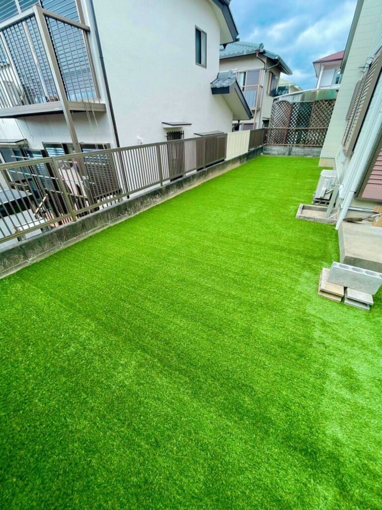 既存のブロックを撤去したうえで下地調整を行い、人工芝を美しく、長くお使いいただけるよう丁寧に施工しています。