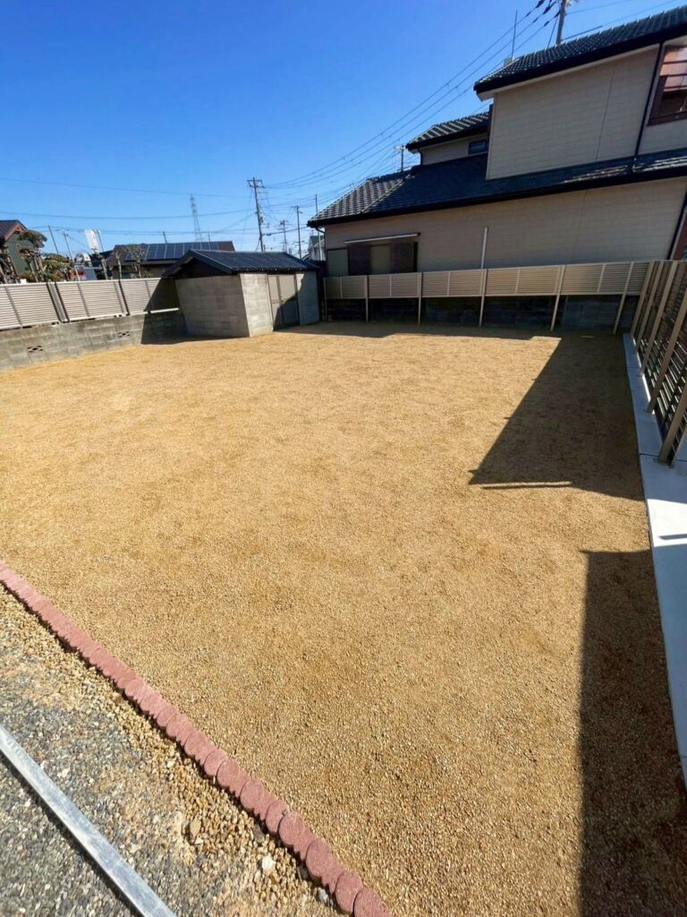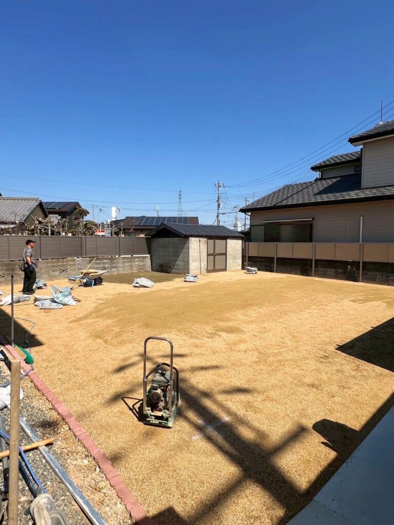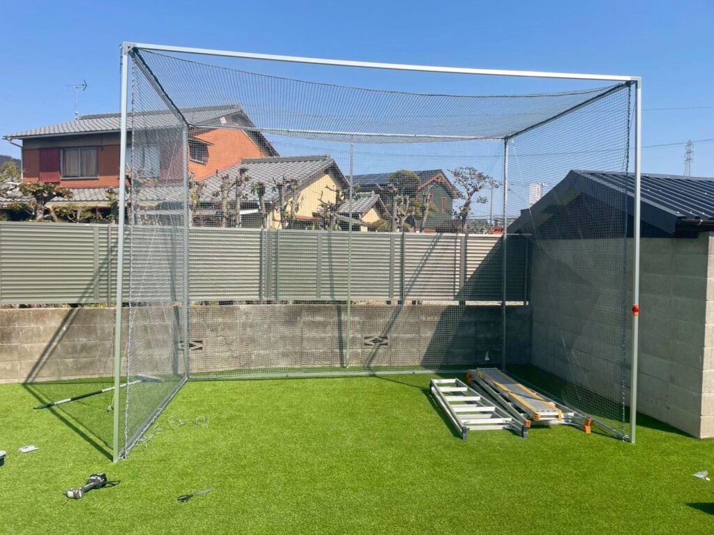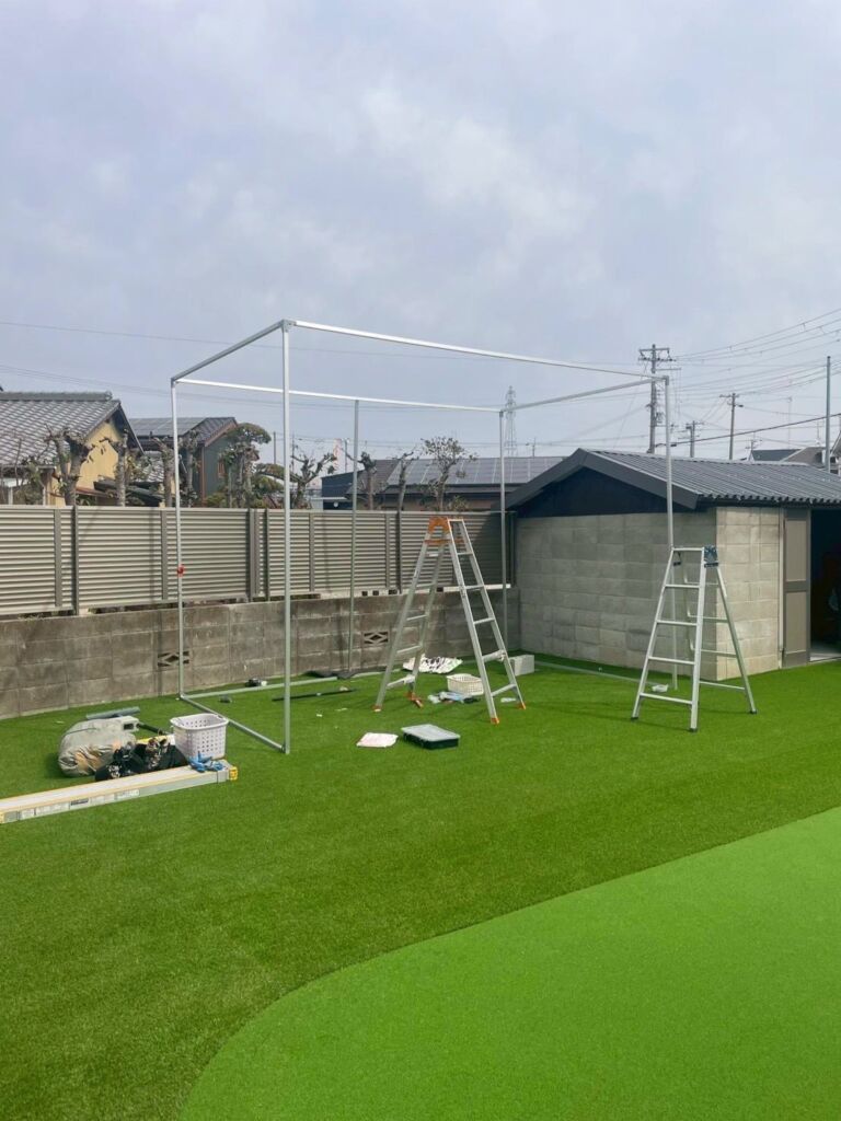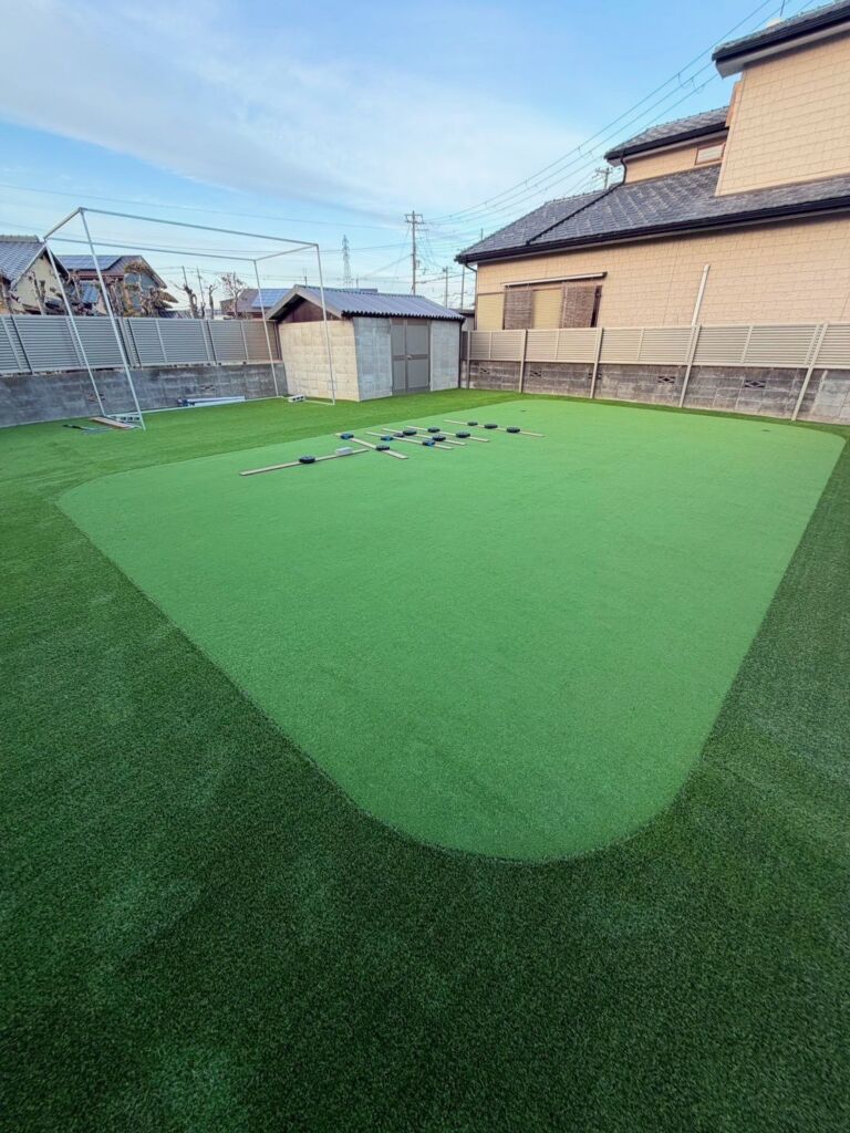 高砂市で人工芝施工・ゴルフ練習場施工|庭140㎡・DX20㎜/カール16㎜使用・防球ネット(フレーム設置)・ゴルフカップ設置・雑草対策
