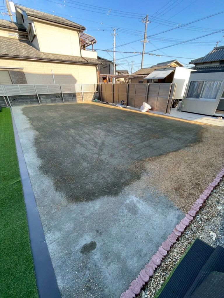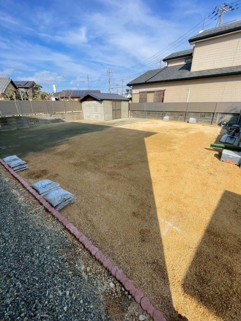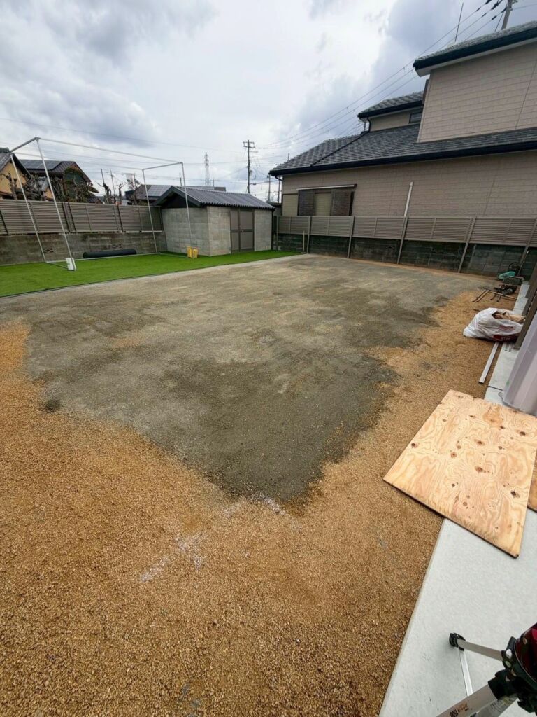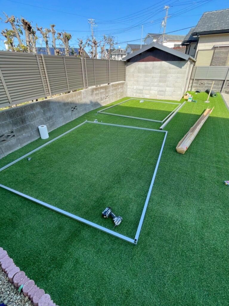 高砂市米田町にて、お庭全体の人工芝施工とゴルフ練習設備の設置を行いました。