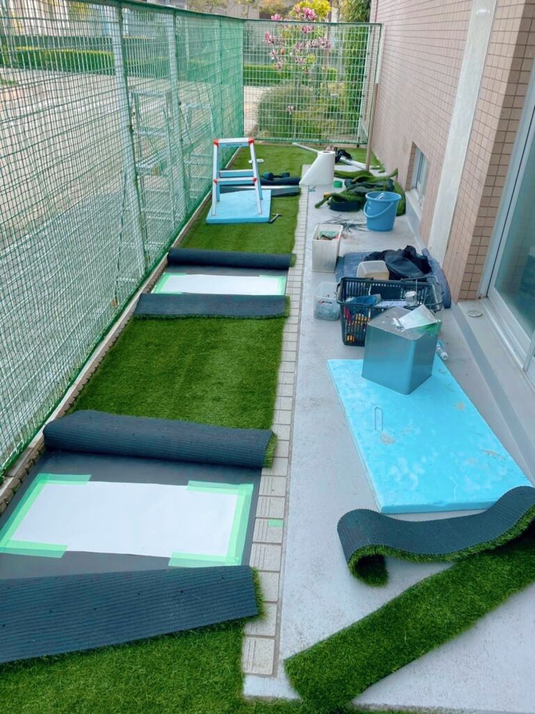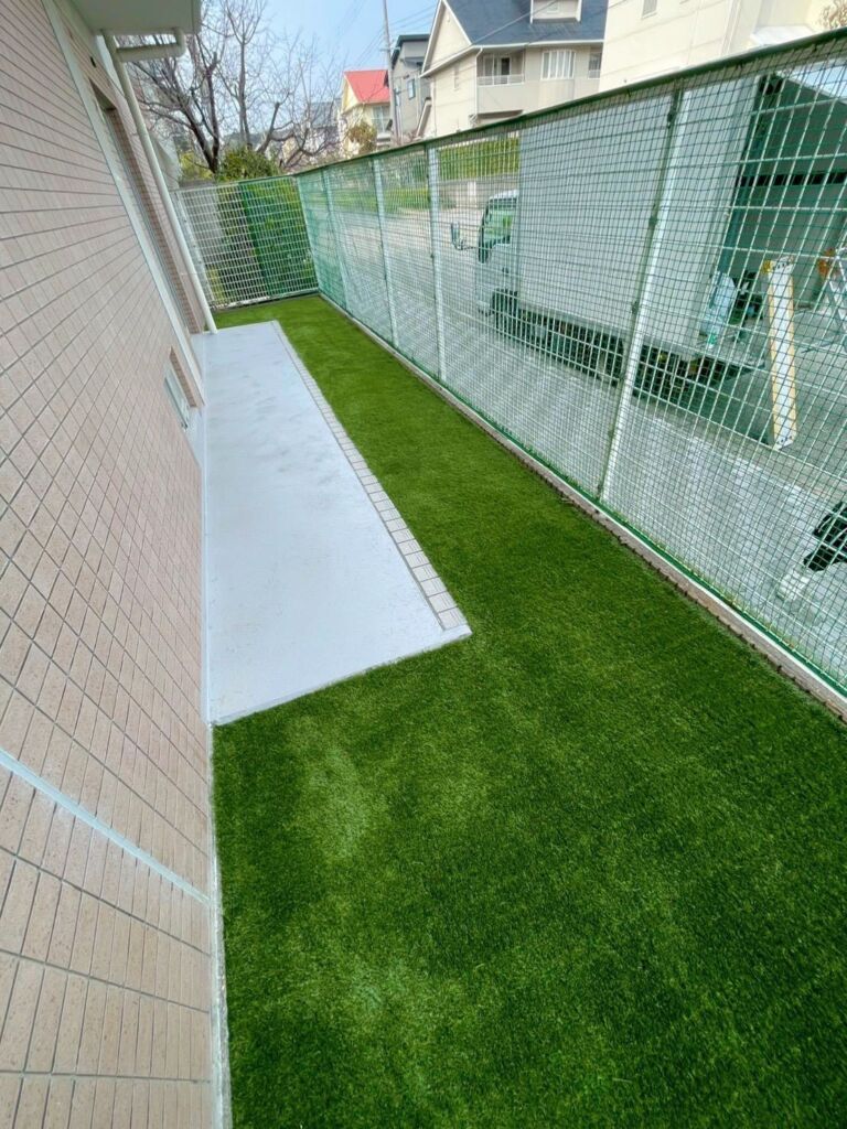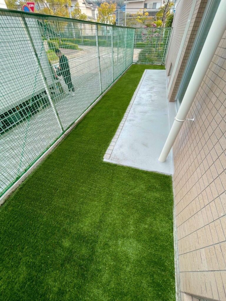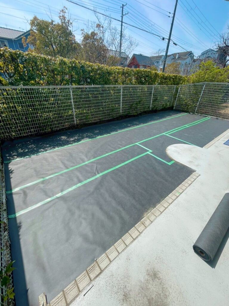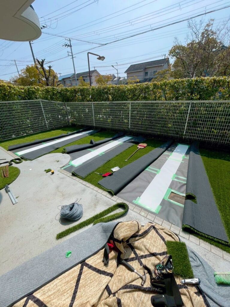その後、防草シートによる雑草対策を行い、上から高品質な人工芝(DX38㎜)を施工しました。