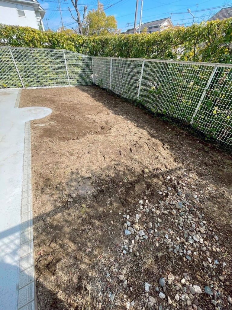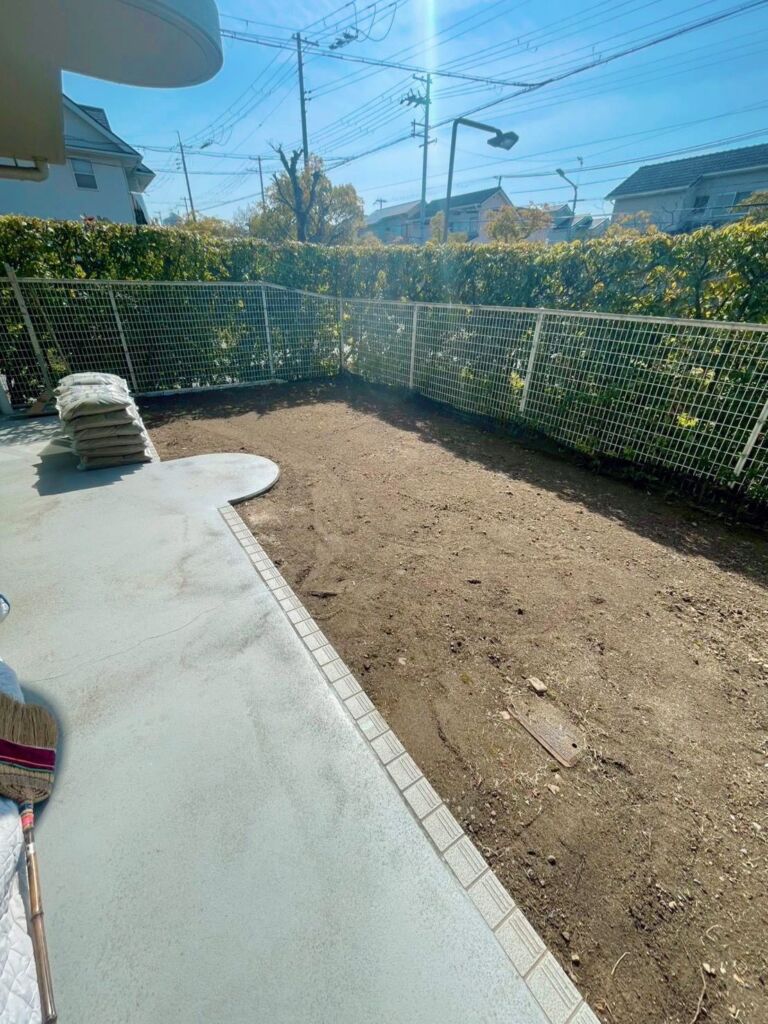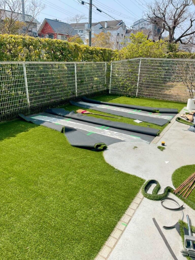 神戸市西区にて、天然芝撤去・人工芝施工・伐採撤去を含む庭リフォーム工事を行いました。