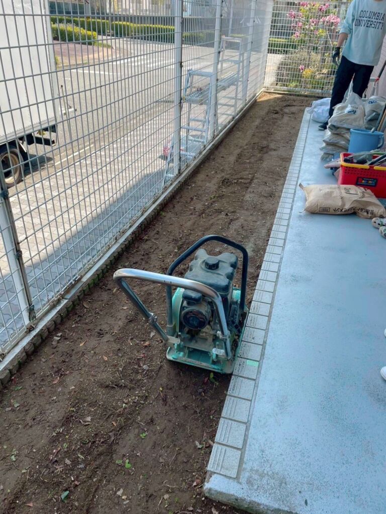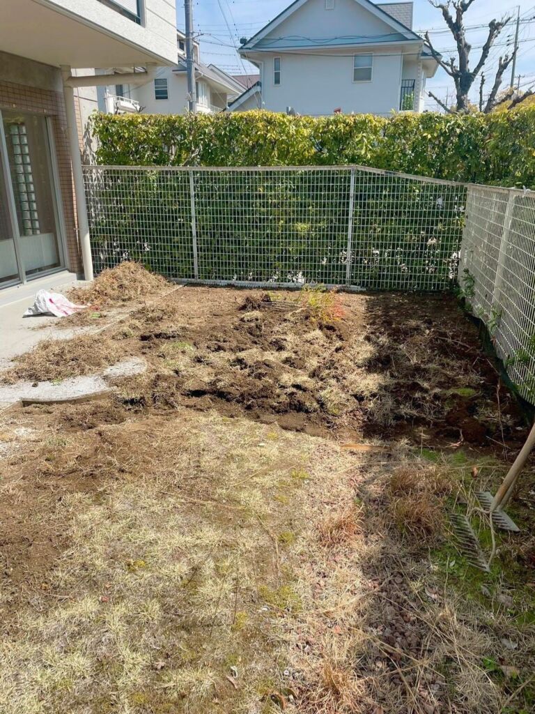 今回の工事では、既存の天然芝を撤去し、植栽の伐採・撤去を実施。